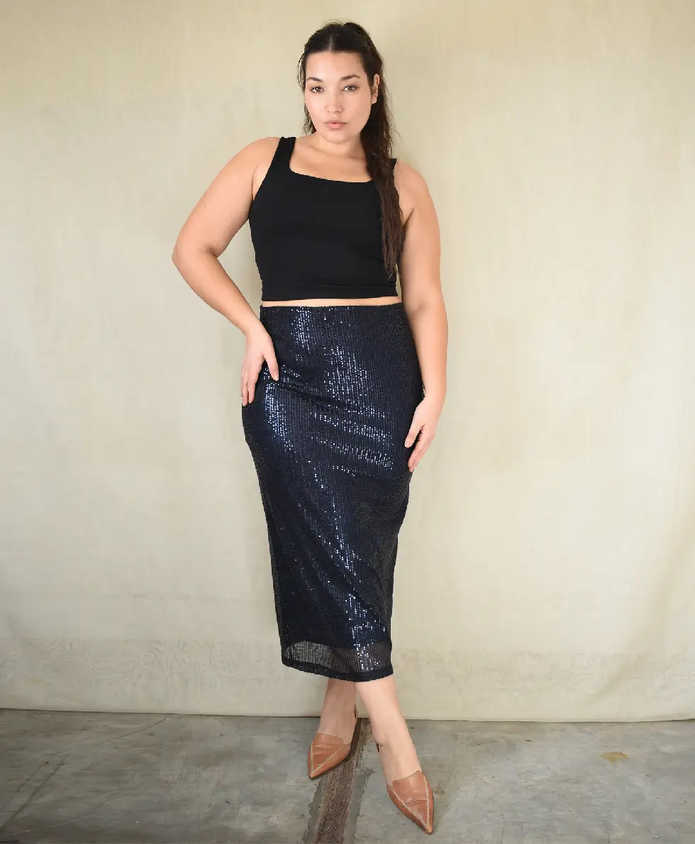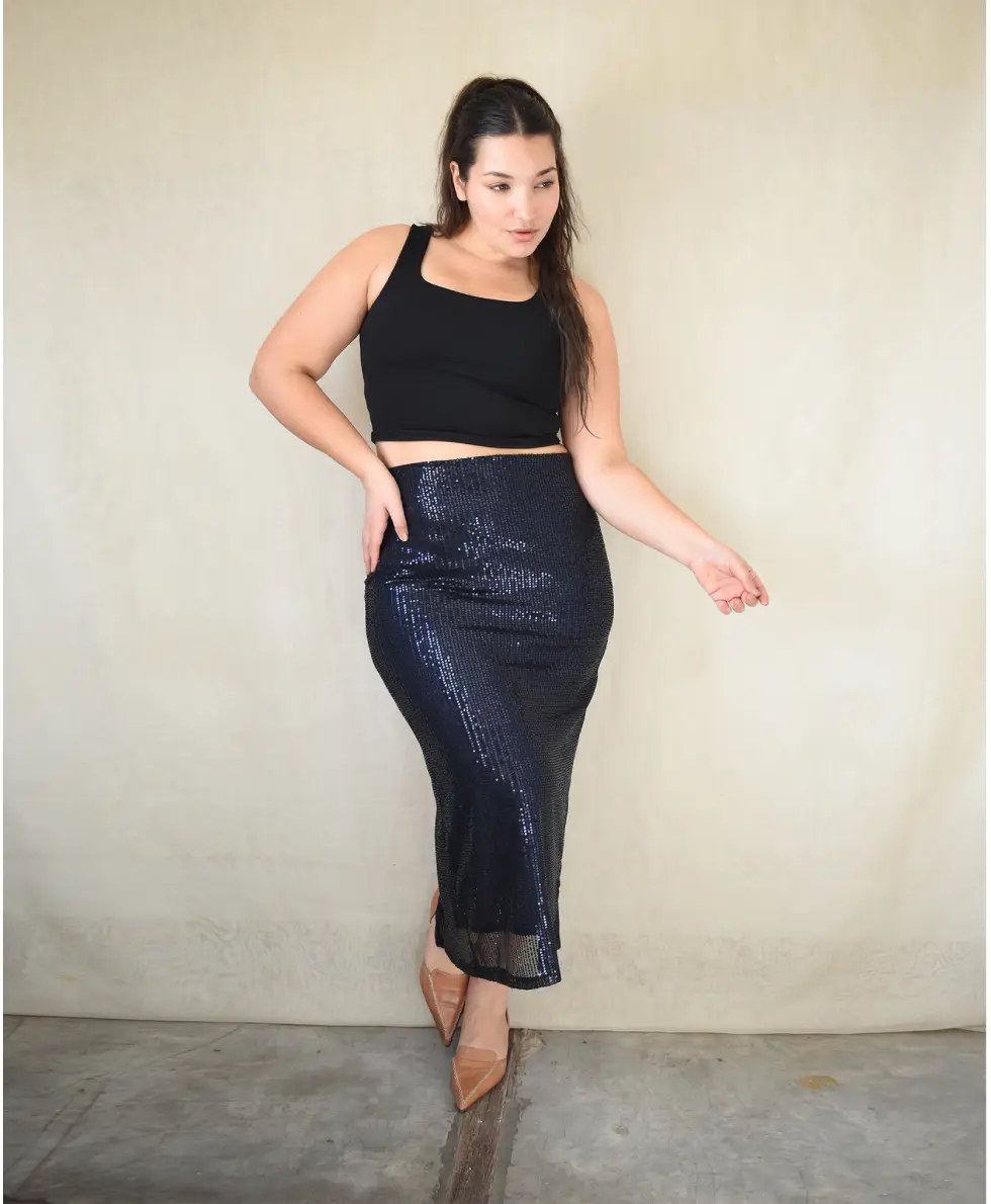La modelo tiene un talle 5 en azul noche.