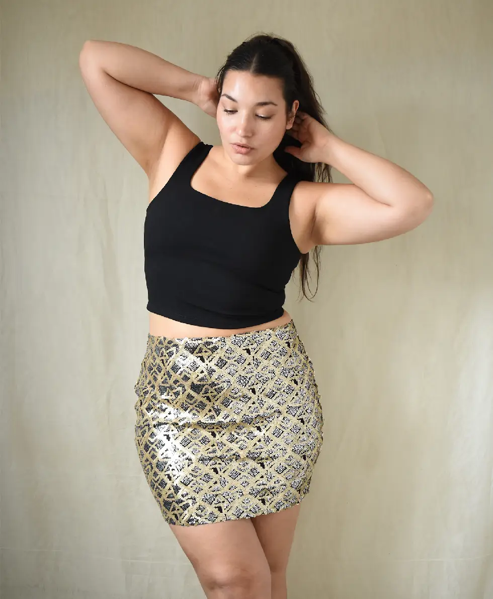 La modelo tiene un talle 4 en dorado.