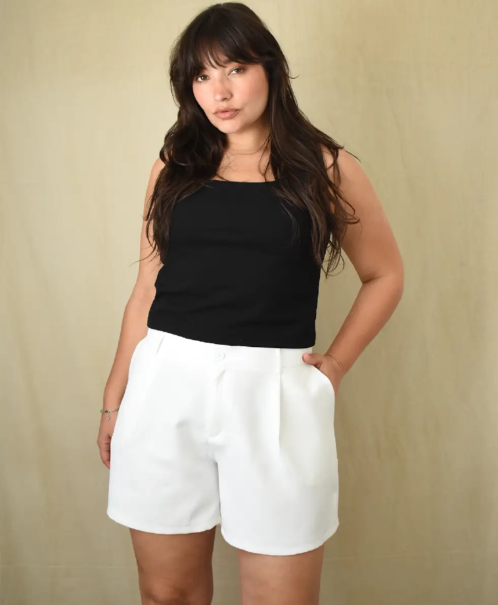 La modelo tiene un talle 5 en blanco (aprox. talle 48 de pantalon).