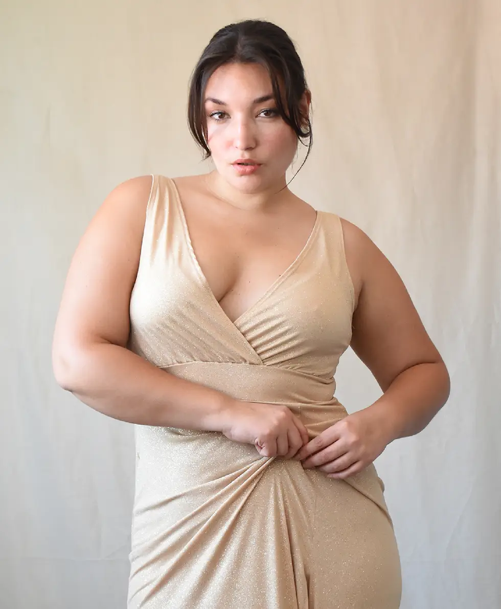 La modelo tiene un talle 3 dorado.