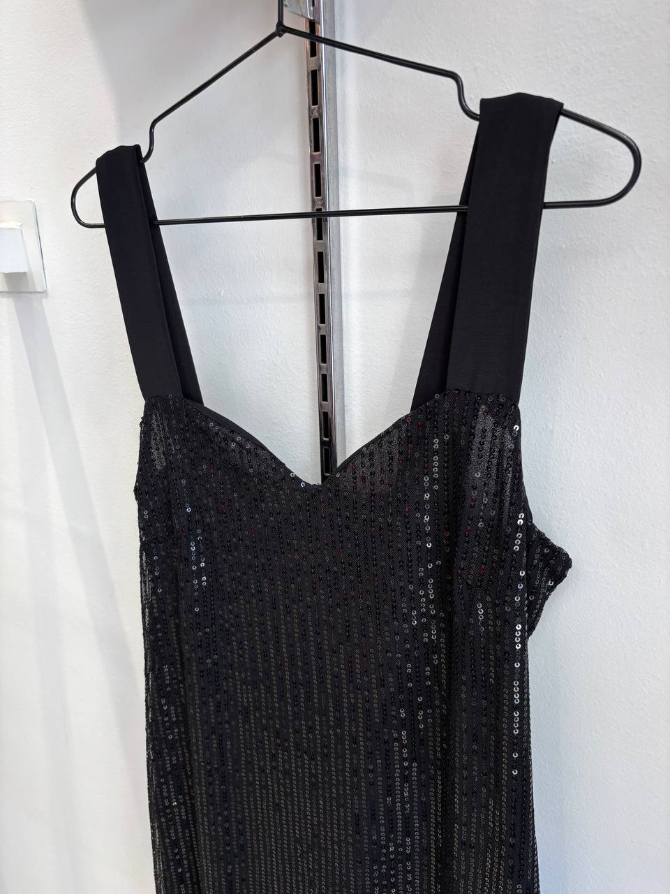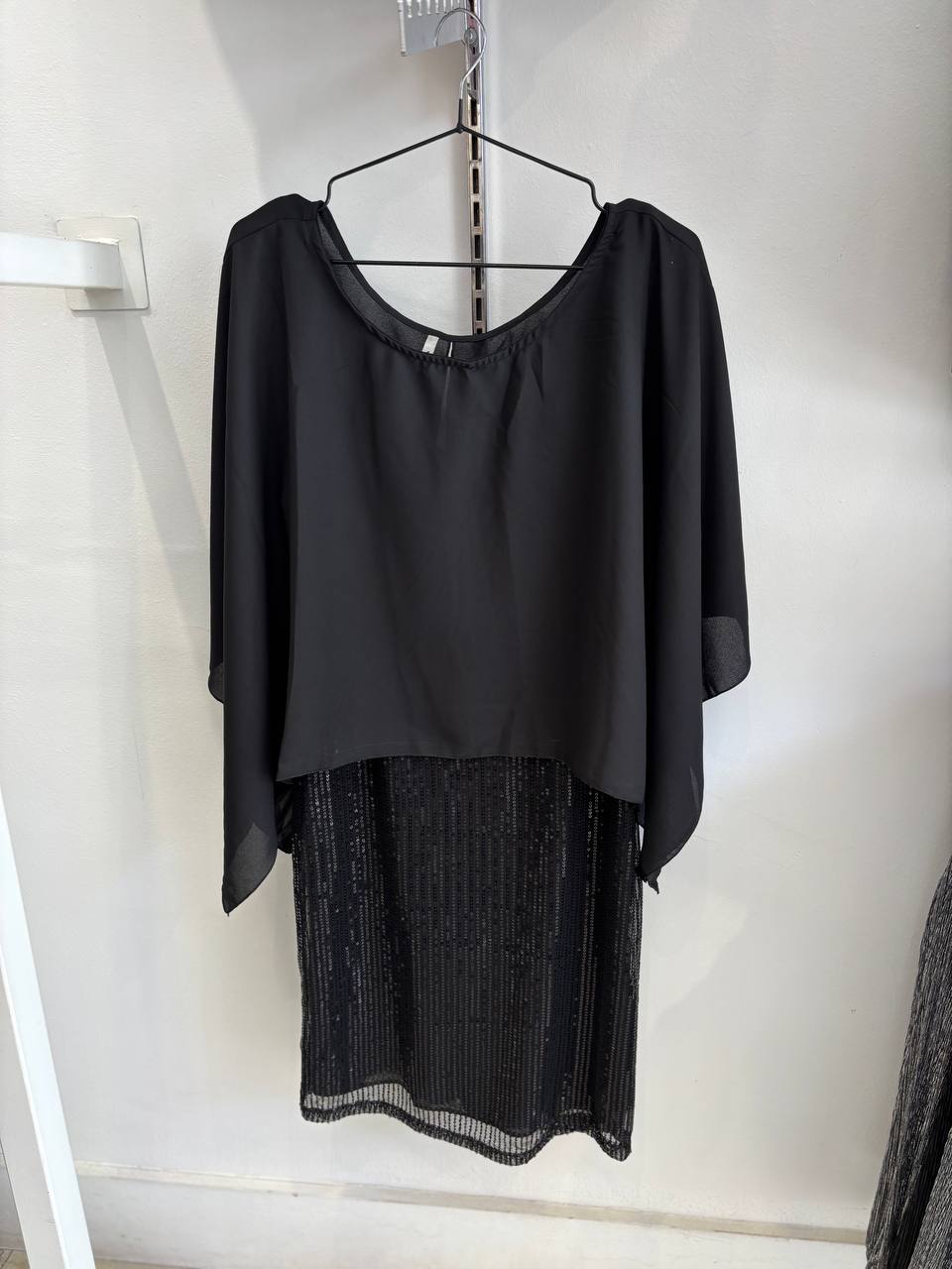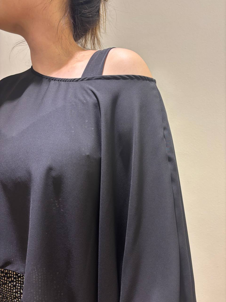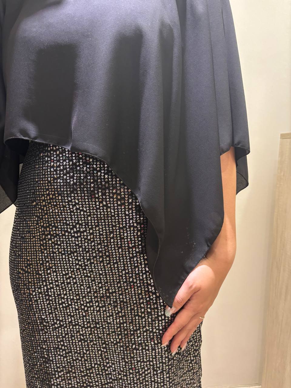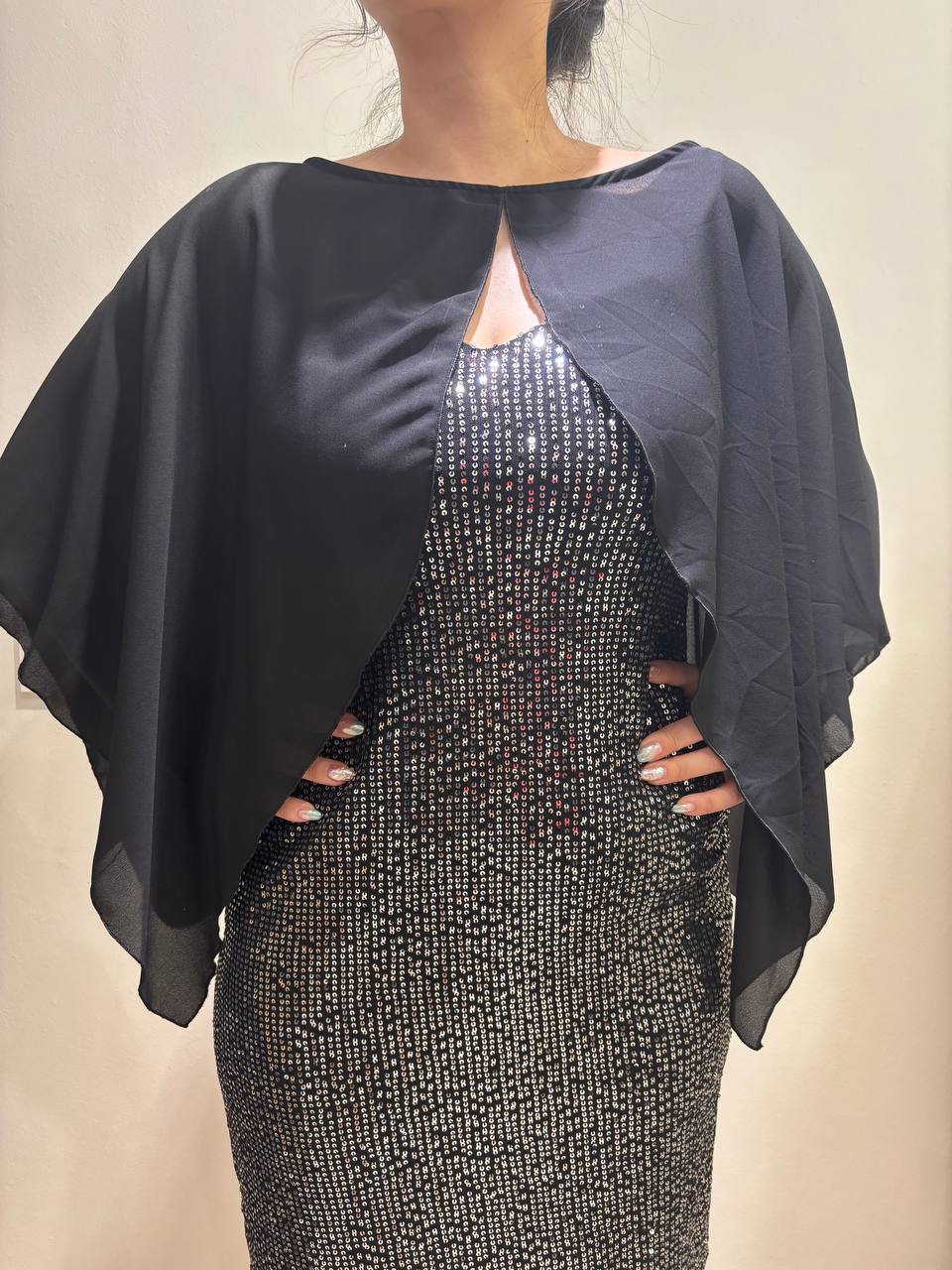 Tela: vestido de Lentejuela Cosida con forro en Crepe y tiras en ITY (seda fria) y capa de Gasa Audi